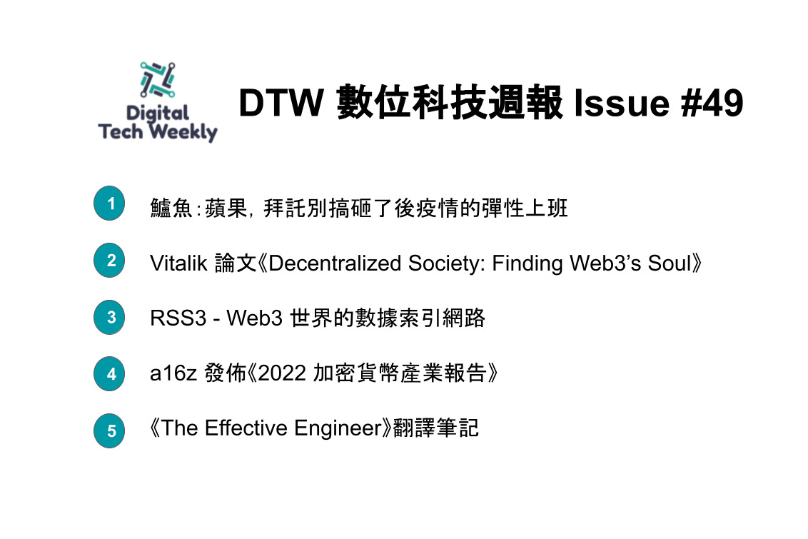 🙌 歡迎來到 DTW 數位科技週報,每週會為讀者精選 5 篇和網路科技及區塊鏈相關的文章,歡迎分享給你身邊會有興趣的朋友們:)